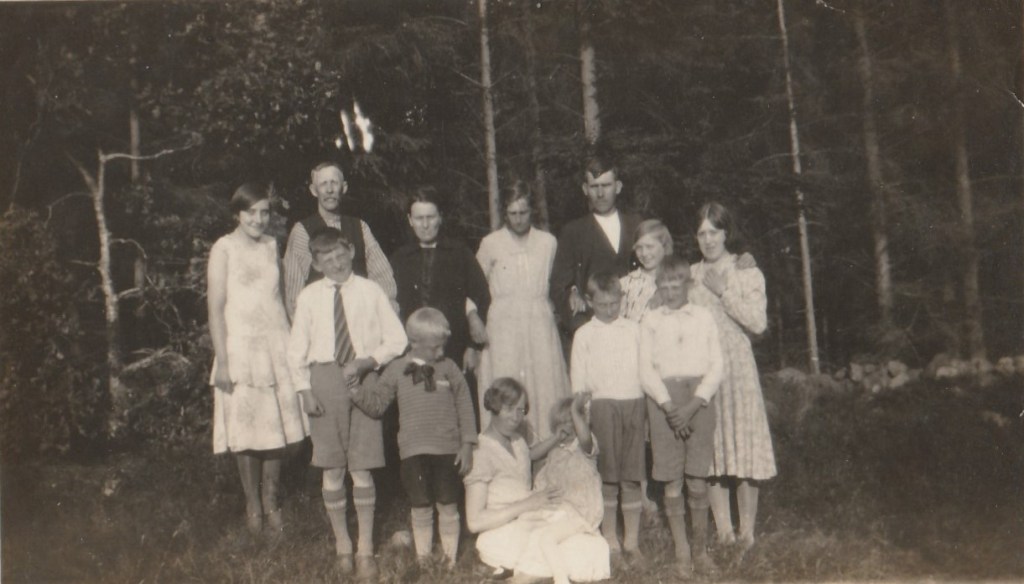 Här står och sitter personalen på Klippans yllefabrik uppradade, sträcker på sig och man ser en antydan till leende hos några av dem. Min farmor sitter på främre raden som 3:e från höger av de som sitter, min farmors syster Ellen sitter som 6:e från samma håll och farmors äldsta syster Signe sitter först i raden från vänster räknat. Töserna var här i 20-årsåldern och min farmor var yngst, född 1904.