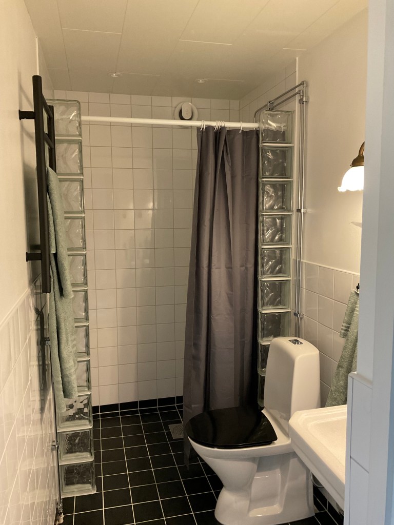 I princip klart, fattas några smågrejor som exempelvis att vi ska ha takdusch (men de beställde fel), så den ska sättas på plats imorgon. Vi ska också sätta dit en taklampa och ett badrumsskåp. MEN i alla fall…igår kunde vi premiärduscha!