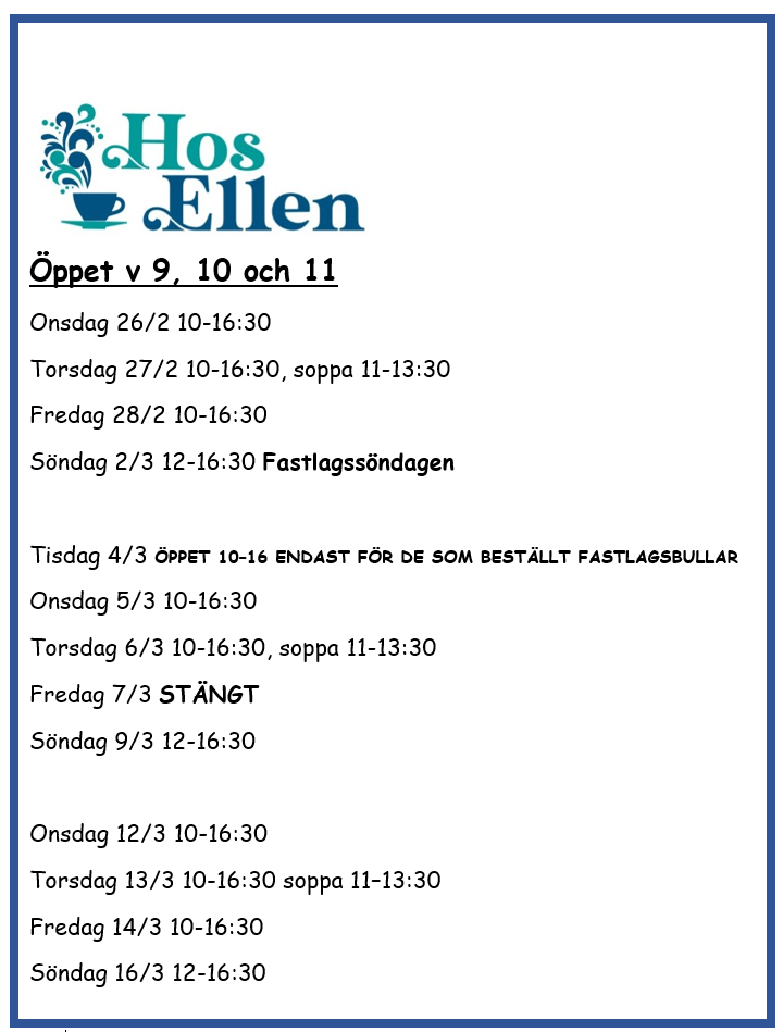 Jag vill gärna ha beställningar minst 5 dagar innan, och gärna ännu tidigare så att jag kan planera för öppettiderna i kaféet.